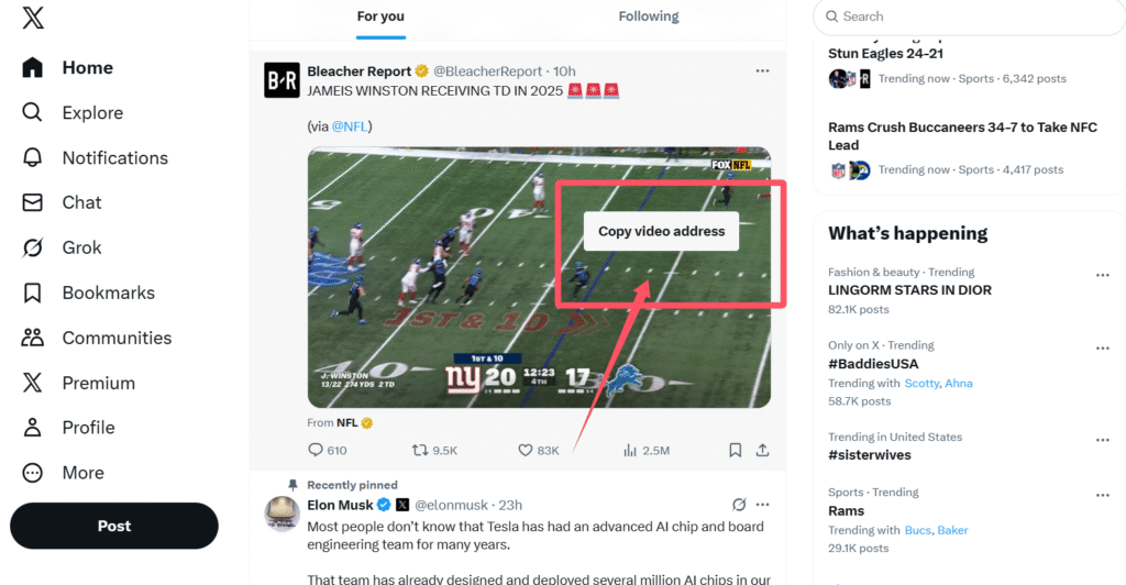 Go to x.com(previously known as Twitter), find the tweet or post you want to save as MP4. Right-click the video or the GIF, and the hint “Copy video address” will pop up; click it to copy.